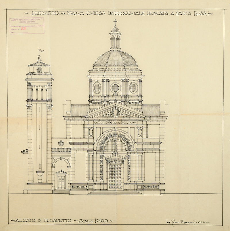 Consapevole delle nuove conquiste tecnologiche e non immune al dilagare dell’incalzante razionalismo, Bazzani disegnò un’architettura impostata sulla stilizzazione geometrizzata delle masse; una architettura che, per la sua monumentalità, per il suo essere isolata e allo stesso tempo fuori scala, per la sua posizione scenografica, resa la chiesa parrocchiale l’edificio più importante della nuova Predappio.