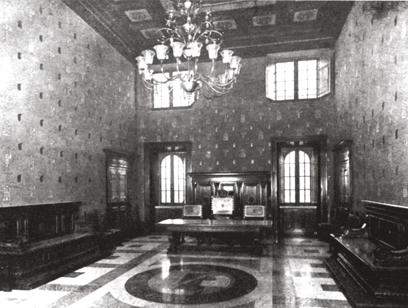 Una lettera del 26 novembre 1927 testimonia che i mobili furono costruiti dalla ditta Rovinazzi e Tonelli di Bologna. Le opere in ferro battuto, lanterne comprese, sono da riferire alla ditta Tullio Ravaglioli di Modigliana; gli stucchi del soffitto a cassettoni della Sala grande furono realizzati dalla ditta Domus di Roma e il lampadario centrale dalla ditta Venini di Murano.